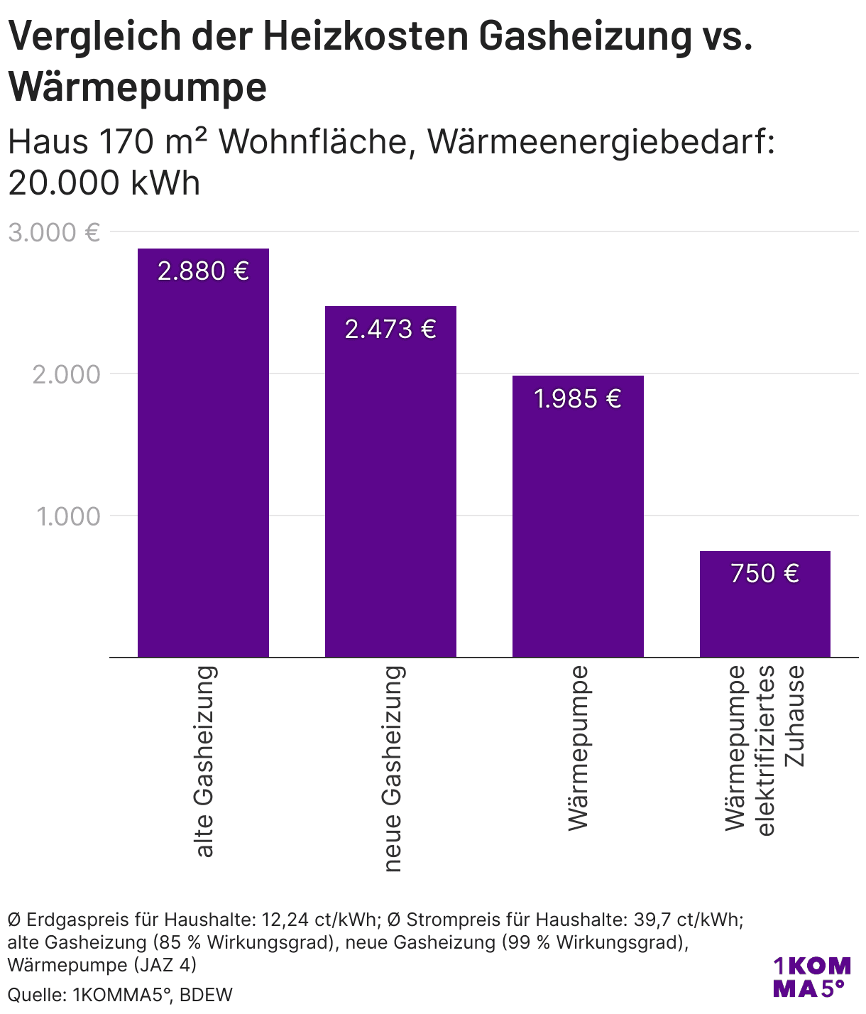 Selbst eine neue, effiziente Gasheizung mit 99 Prozent Wirkungsgrad liegt bei Heizkosten von 2.473 Euro pro Jahr. Eine Wärmepumpe in Kombination mit Photovoltaik, dynamischem Stromtarif, Speicher und intelligenter Steuerung reduziert die Beispielrechnung auf 750 Euro im Jahr. Die jährliche Ersparnis gegenüber der alten Gasheizung liegt damit bei 2.130 Euro. Das ist ein Rückgang der Heizkosten um 74 Prozent.1